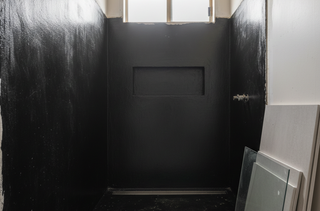 The plumbing rough-in happens immediately after demolition and substrate preparation. This stage takes one to two days depending on whether pipes are being relocated. Once plumbing is complete, the waterproofer applies the membrane.